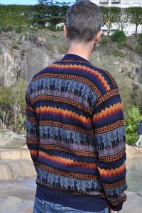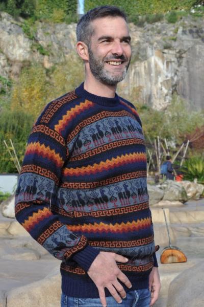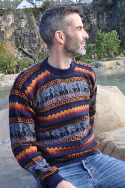 Pull-over jacquard homme couleur bleu marine en alpaga. Un pull-over homme confortable, élégant et chargé d’histoire.