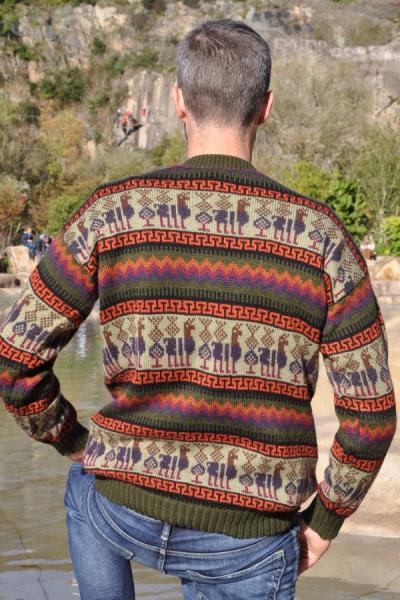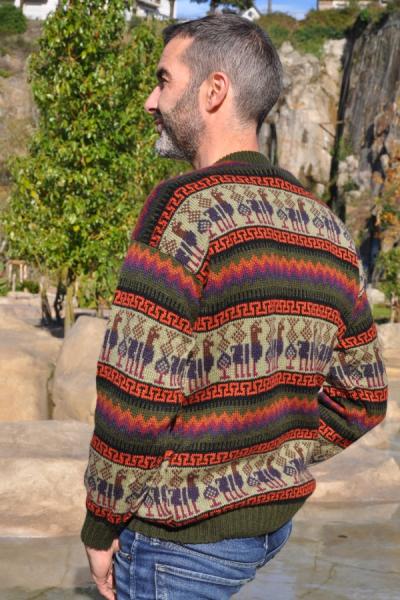 Pull-over jacquard homme couleur beige et kaki en alpaga. Avec ses motifs lamas des Andes, ce pull allie style, chaleur et authenticité.
